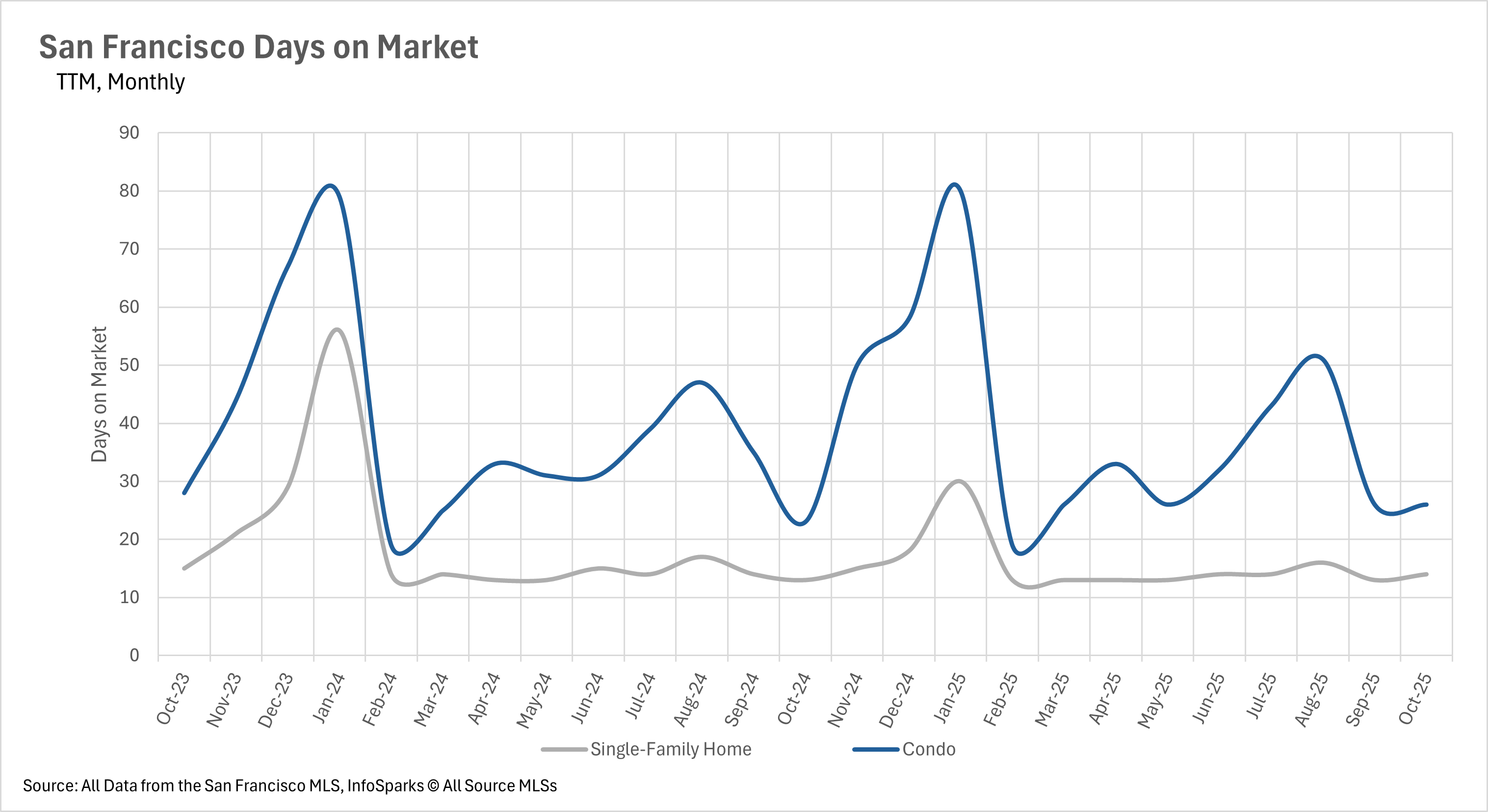 This year, it very briefly seemed like San Francisco would be able to exit the inventory glut that’s plagued the area for the past couple of years. However, that wasn’t the case. Today, we’re looking at inventory levels that are 35.54% lower than they were last year in the single-family home market, and 40.68% lower in the condo market. Unfortunately, it looks like the struggle for inventory will continue into the winter months. It’ll be important to pay attention to this metric over time, as it’s probably the most influential factor driving pricing in the area.