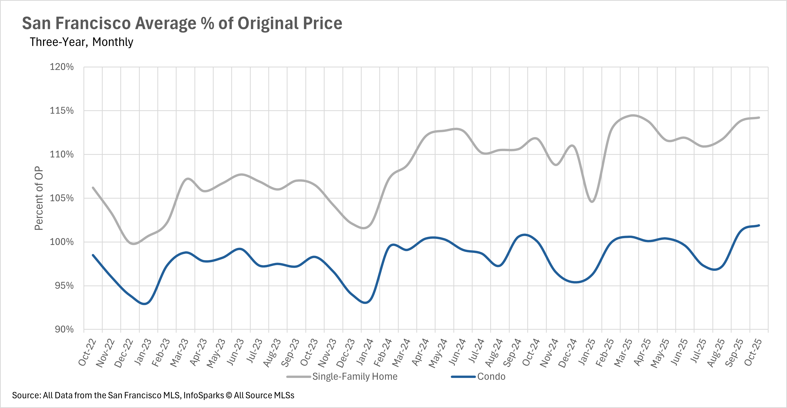 The single-family home market is on fire in San Francisco right now, as the median sale price for a single-family home is reaching the highest level it’s reached in the past two years! This surge in price represents 7.29% year-over-year increase. However, on the flip side, the condo market is not quite as hot, with condos continuing to trade within the band that they typically sell for. With that being said, it’s unlikely for buyers to purchase a home under the asking price, as the average single-family home is selling for 114.2% of the original asking price, and the average condo is selling for 101.9% of the original asking price.