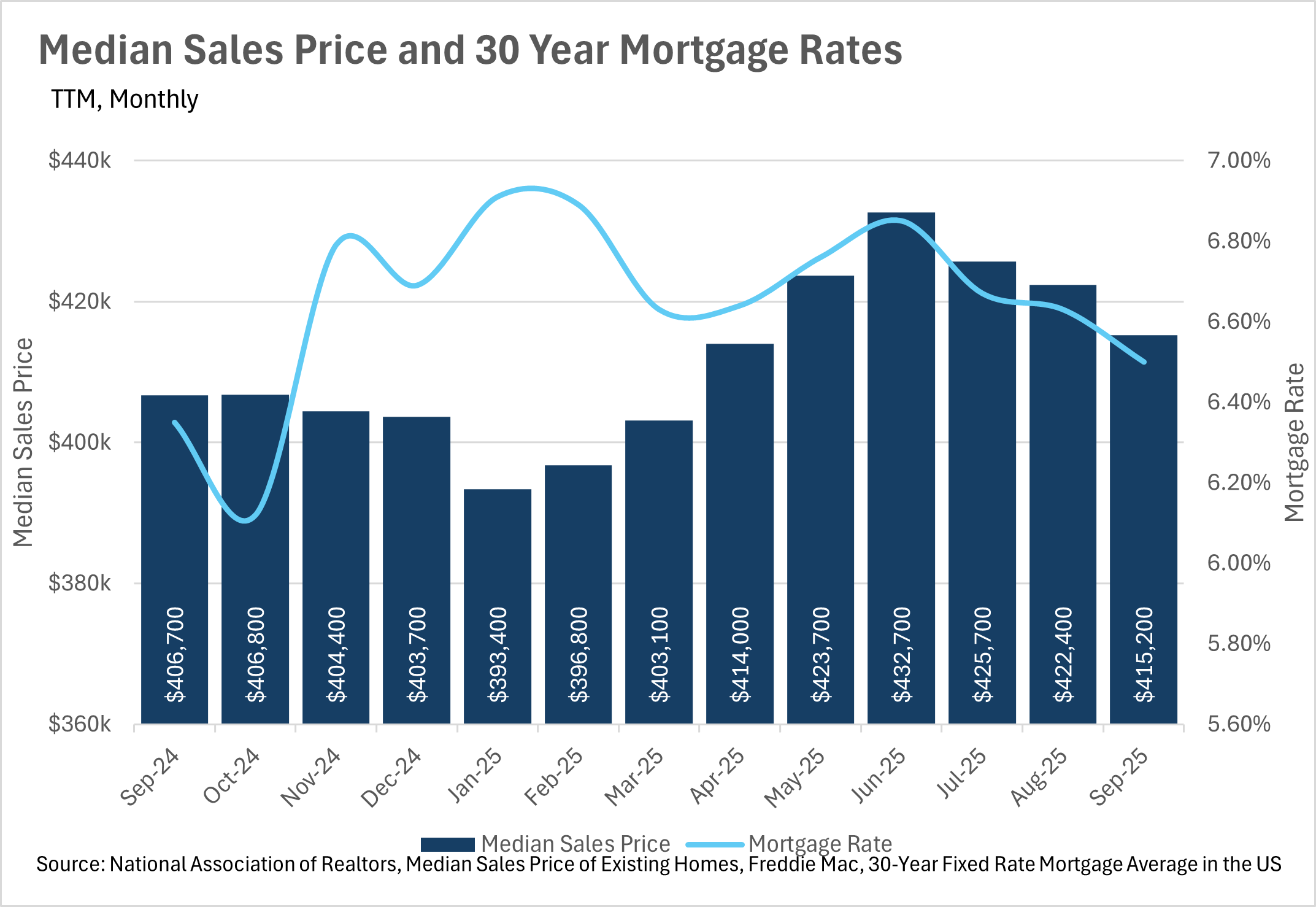In the Fed’s October FOMC meeting, they decided to cut the federal funds rate by another quarter point, making the overnight interest rate range between 3.75% and 4.00%. This led mortgage rates to fall in unison, which is great news for prospective buyers and recent buyers that made the bet that they would be able to refinance at a lower rate sooner rather than later. It’ll be important to look at the economic data that’s released once the government shutdown ends, as this data is what the Fed bases their interest rate decisions on. Once we receive some more clarity regarding economic data, then we’ll have a better idea of whether or not to expect a rate cut in December.