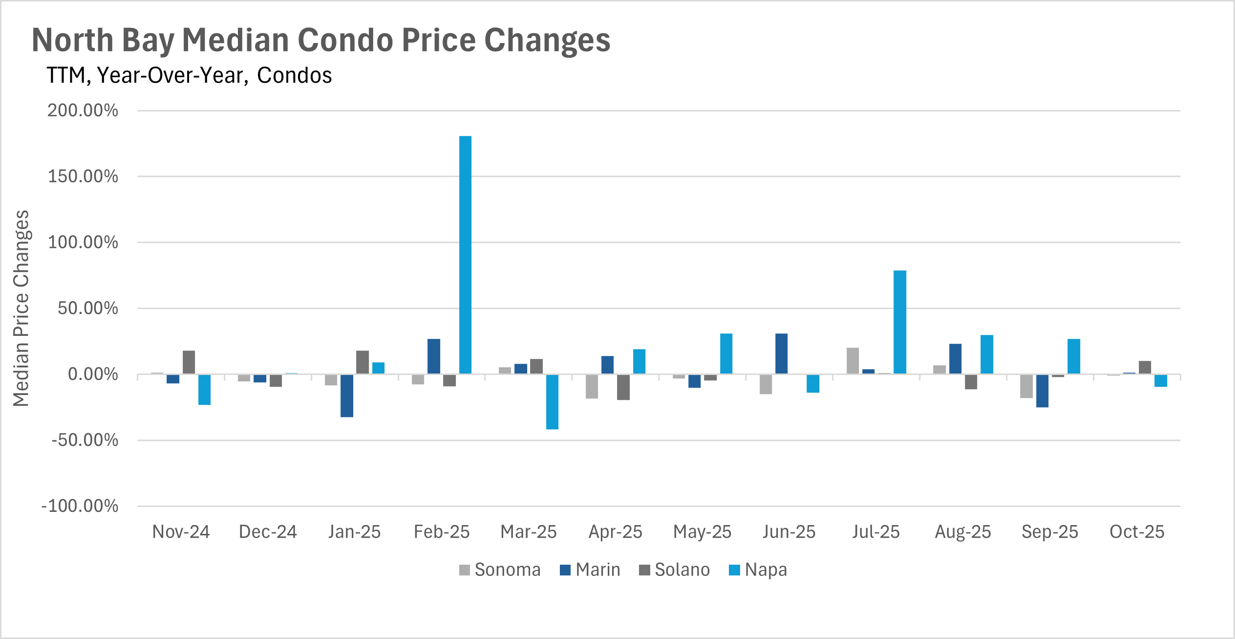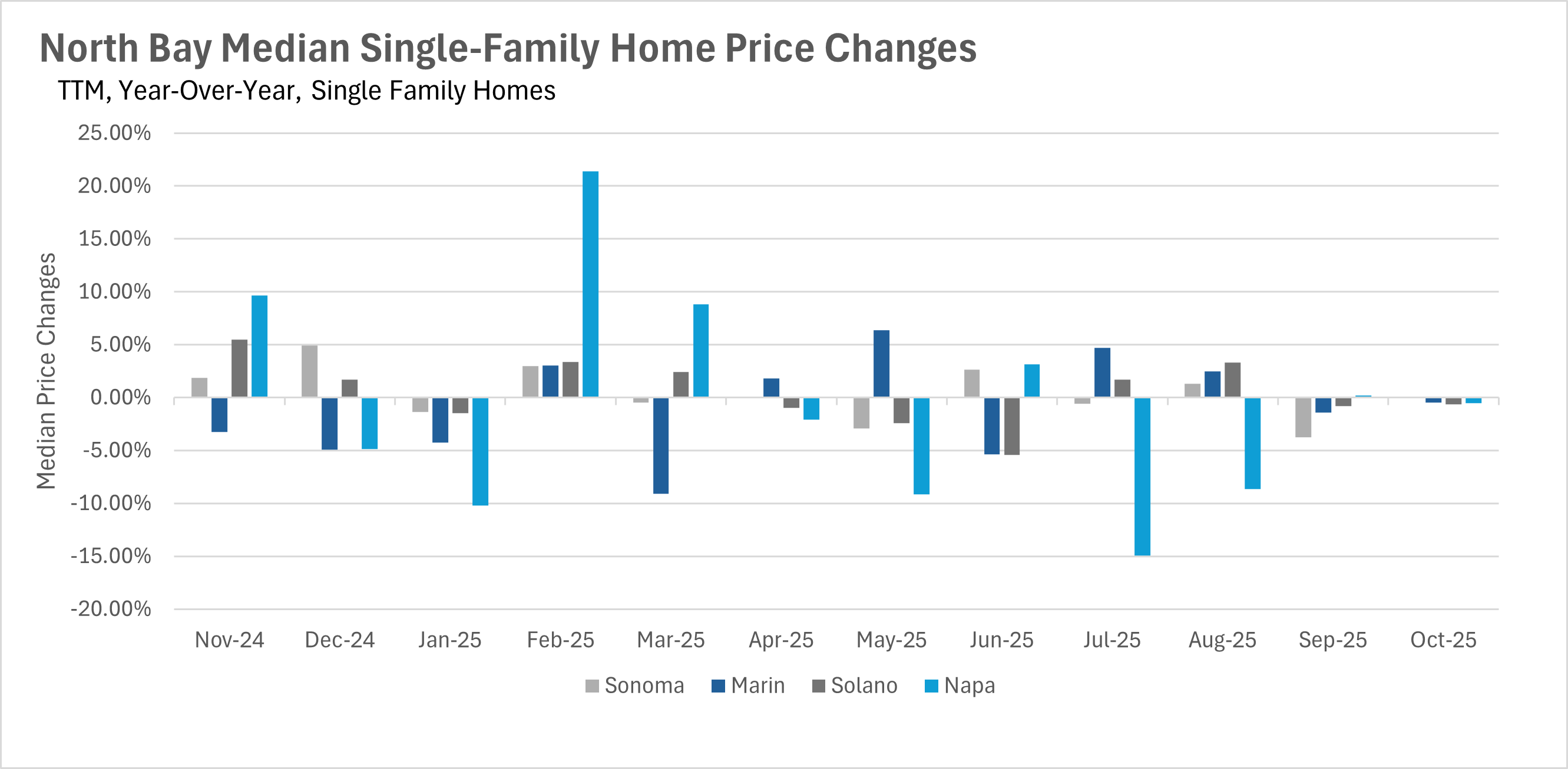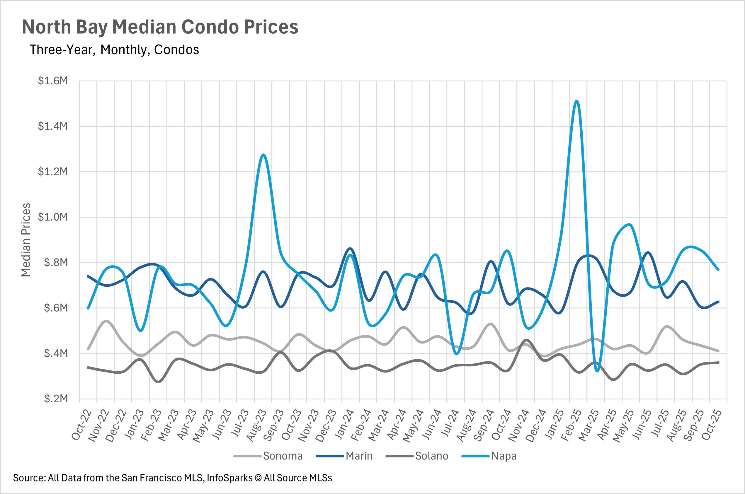 Unfortunately, there isn’t much to talk about in terms of median sale prices in the North Bay. Pricing for single-family homes in every county, and condos in Sonoma and Marin Counties, didn’t deviate much from where they were around this time last year. However, we did see some volatility in the Solano and Napa County condo markets. The Solano County condo market saw the median sale price jump by 10.26% on a year-over-year basis. On the flip side, the Napa County condo market saw a 9.49% decline on a year-over-year basis.