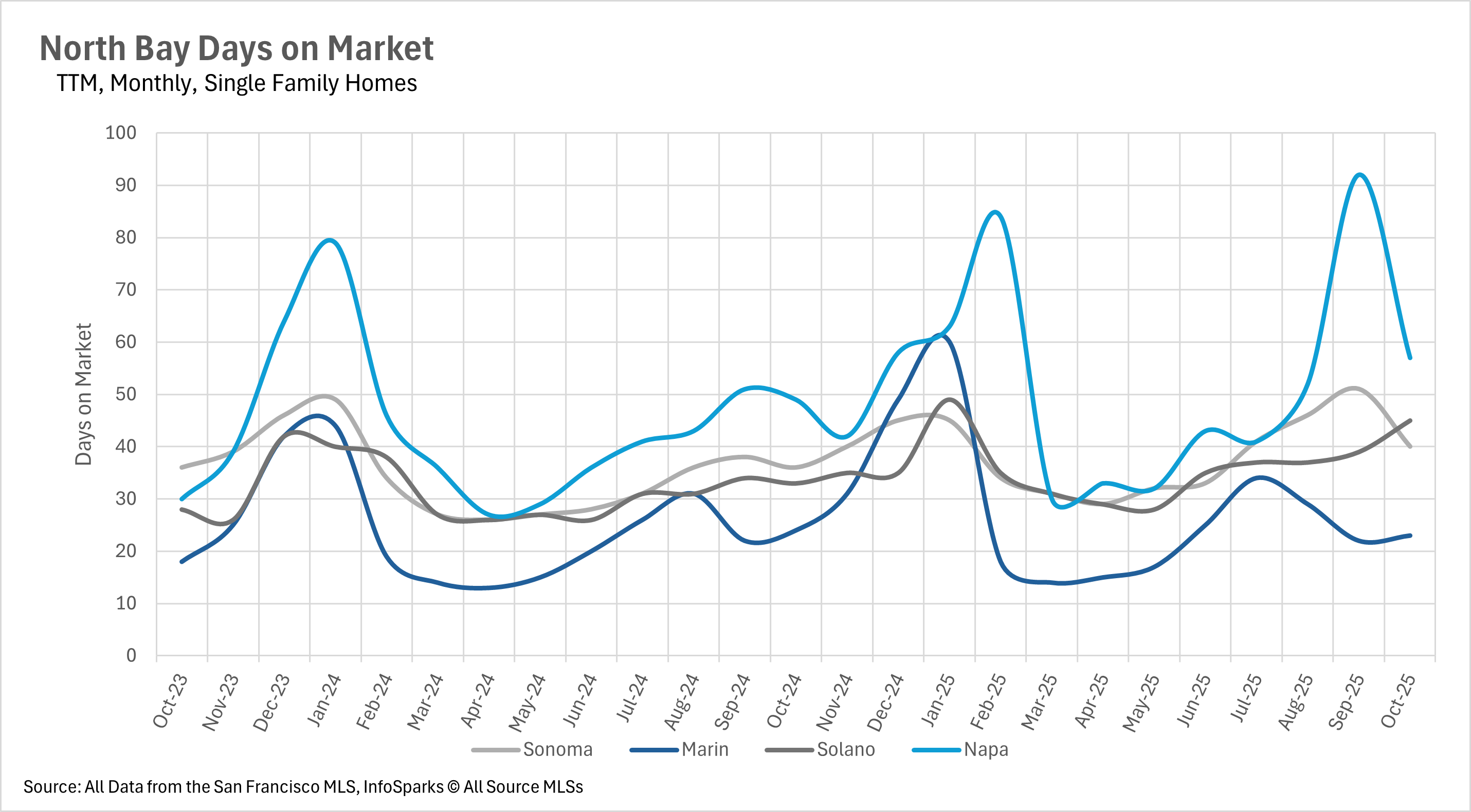 When inventory levels drop as suddenly as they did this month, you might expect the amount of time a listing is on the market to do the same. The average single-family home was on the market for 11.11% longer on a year-over-year basis in Sonoma County, 36.36% longer in Solano County, and 16.33% in Napa County. Whereas the average single-family home listing in Marin County spent 4.17% less time on the market. However, it’s important to note that new listings hitting the market are a leading indicator, while days on market are a trailing indicator. This is mostly attributable to the fact that real estate transactions take quite a bit of time. However, we’ll likely see a shift in days on market in next month’s data.