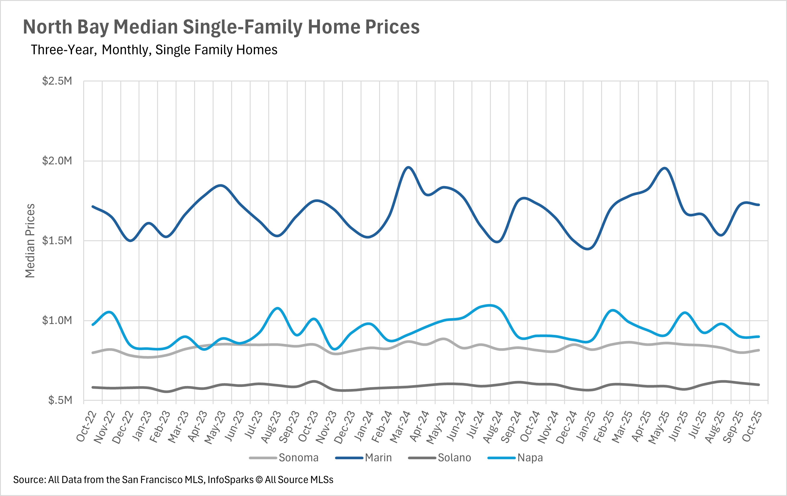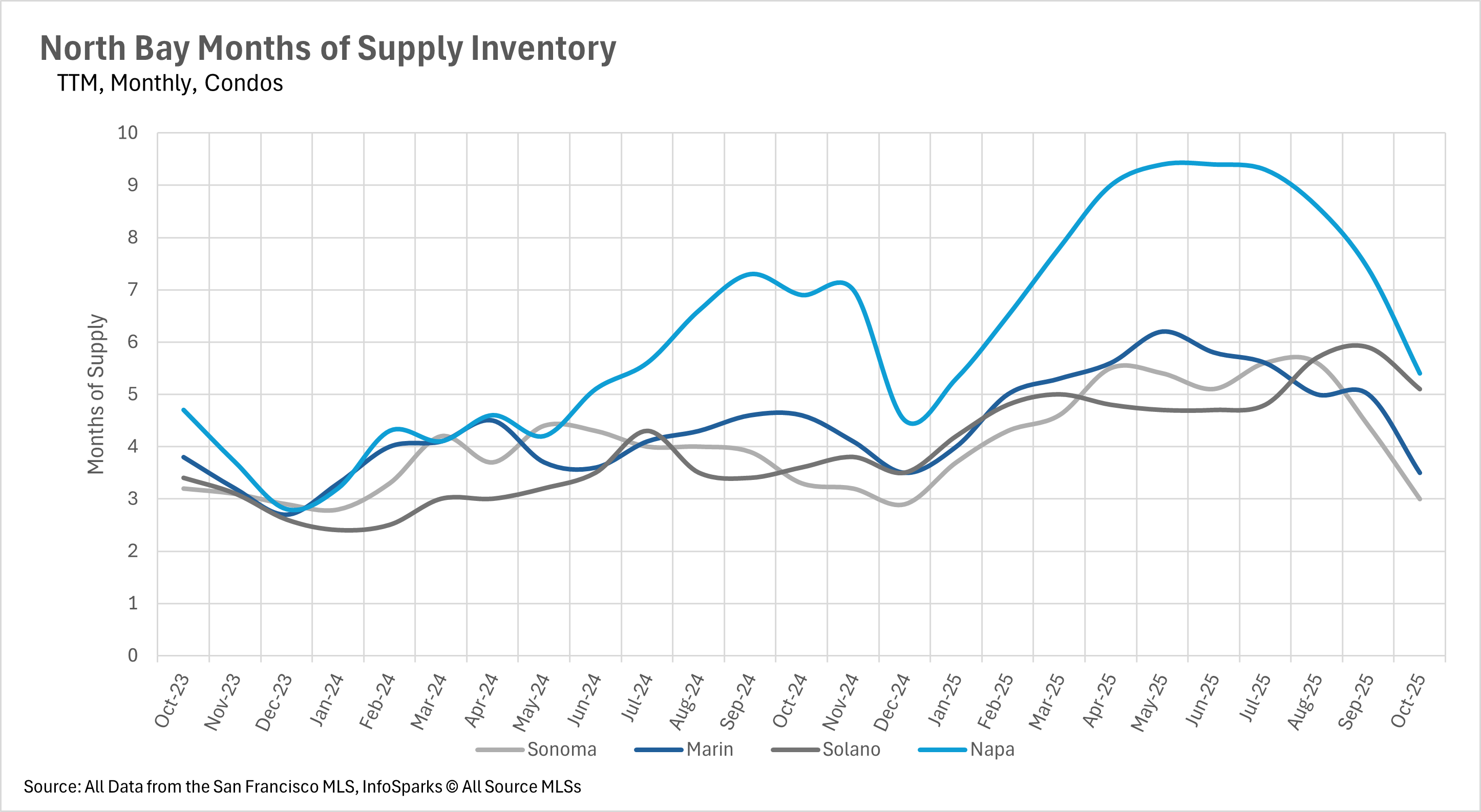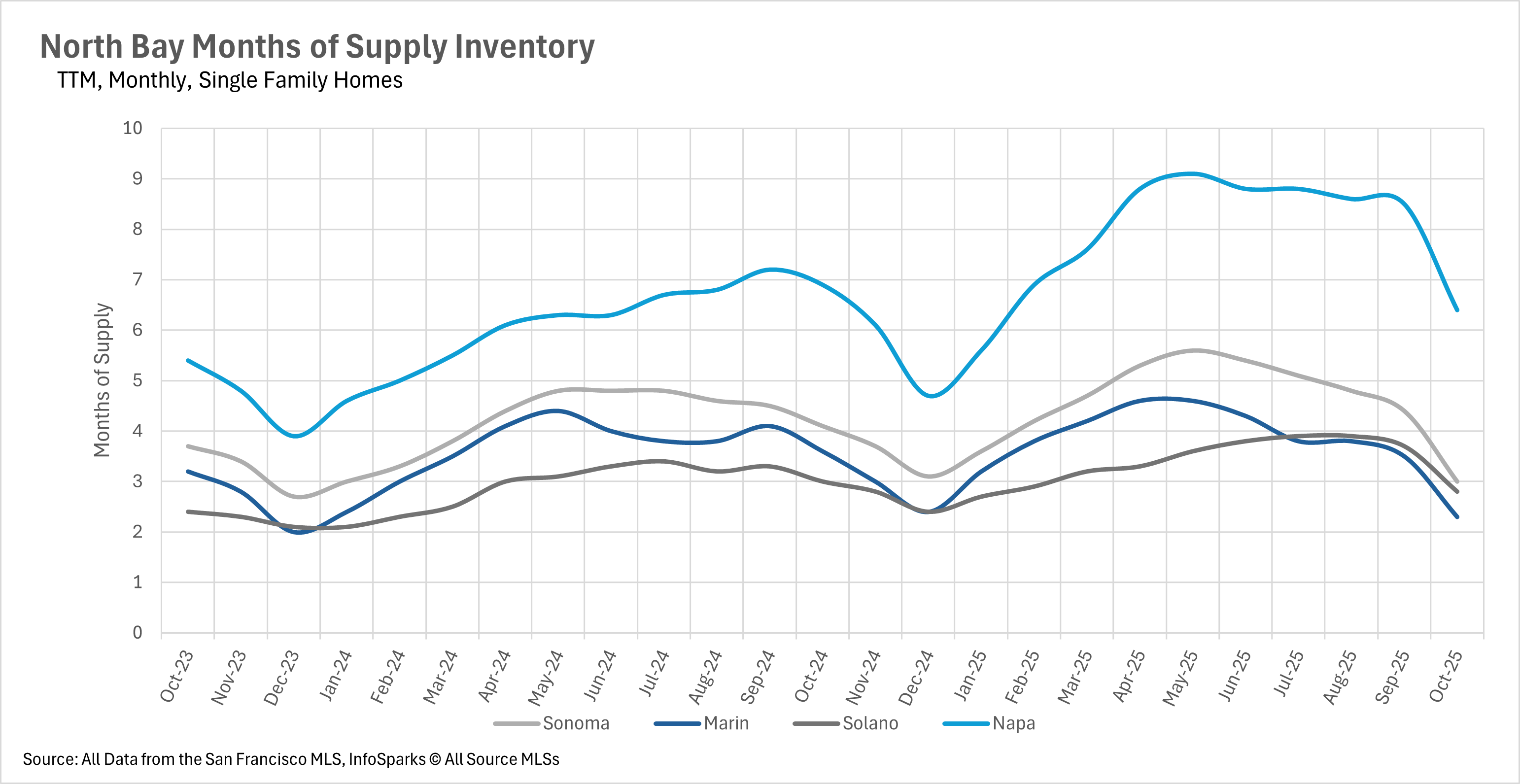 Throughout much of the year, inventory was building up throughout the entirety of the state. However, we saw the North Bay buck the trend in a huge way this past month, as single-family home inventory decreased by 14.06% on a year-over-year basis, and condo inventory decreased by 10.11% on a year-over-year basis. This decline was driven mainly by the fact that the rate of new listings hitting the market shrank by a considerable margin (25.41% for the single-family home market and 8.91% for the condo market), while the number of sold listings remained roughly the same on a year-over-year basis. This led to the steeper-than-usual drop-off that we can see in the accompanying chart.